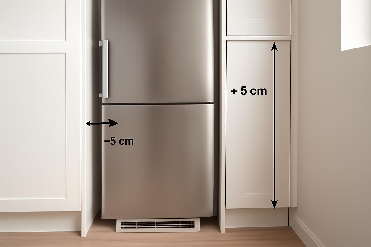 - Wolną przestrzeń u góry: Nad lodówką również potrzebna jest szczelina (również ok. 5 cm), aby gorące powietrze mogło swobodnie uchodzić do góry, za szafkami.